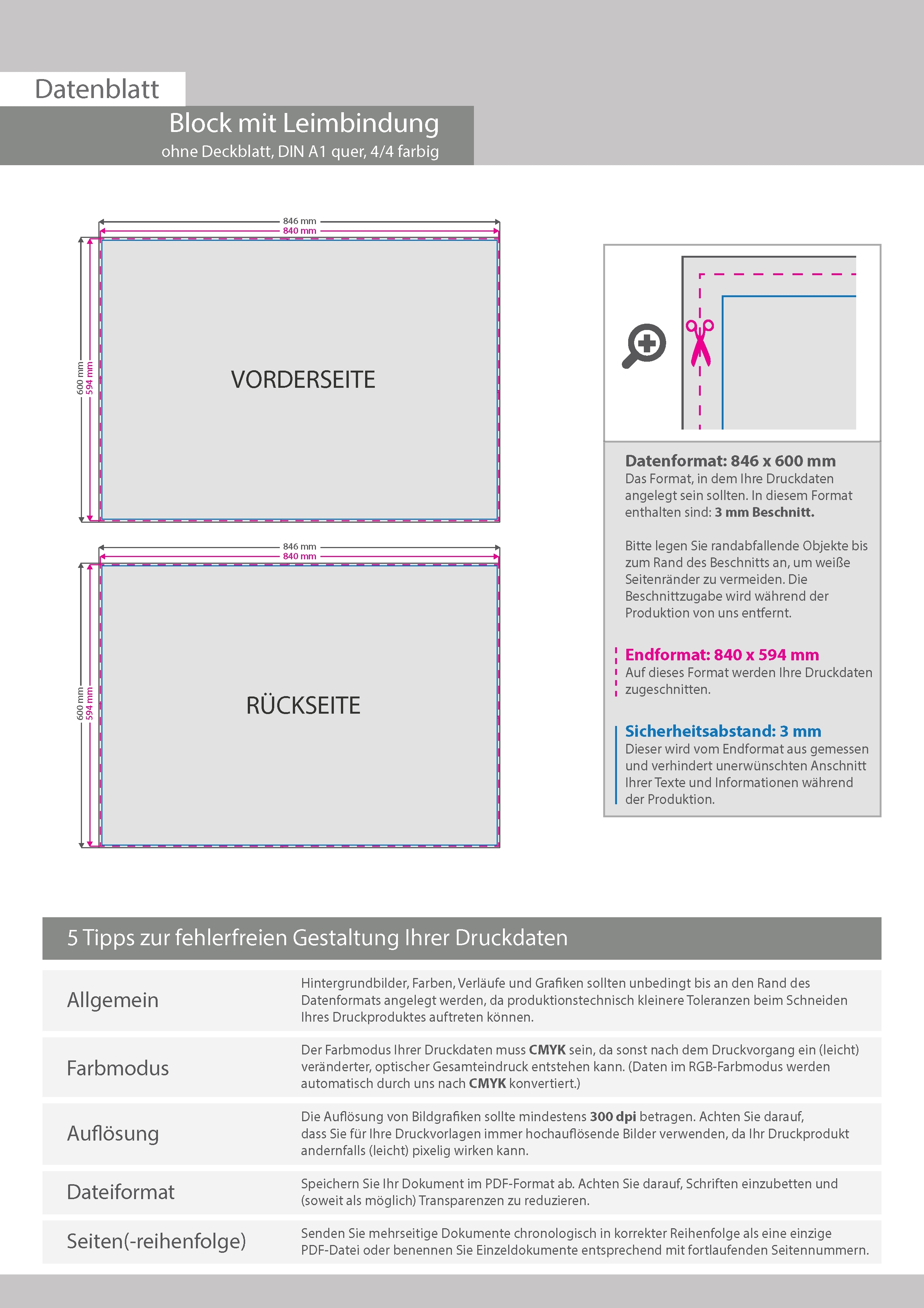 Block mit Leimbindung, DIN A1 quer, 50 Blatt, 4/4 farbig beidseitig bedruckt