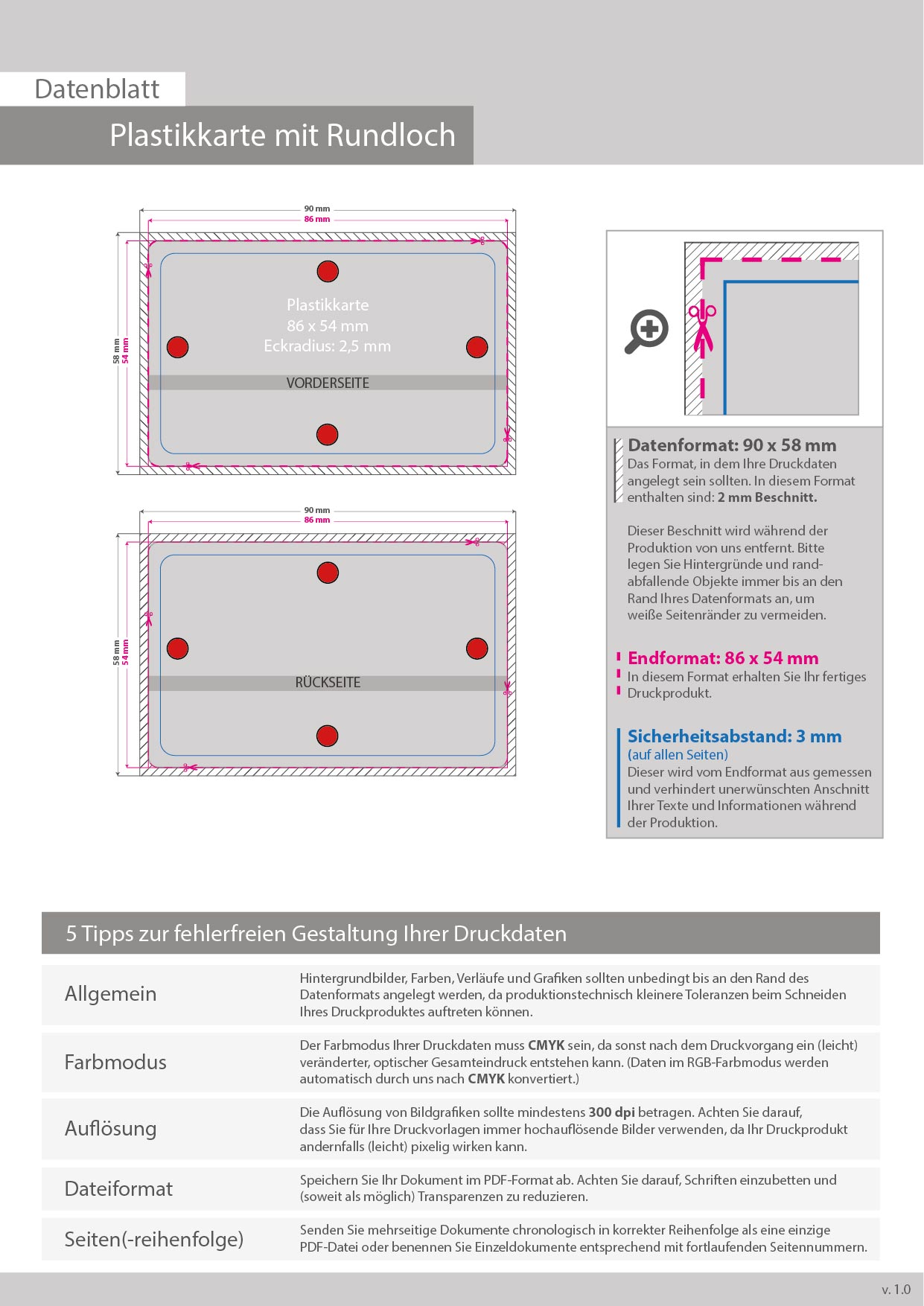 Plastikkarte mit Lochung 4/4 farbig bedruckt auf silbernem Hintergrund