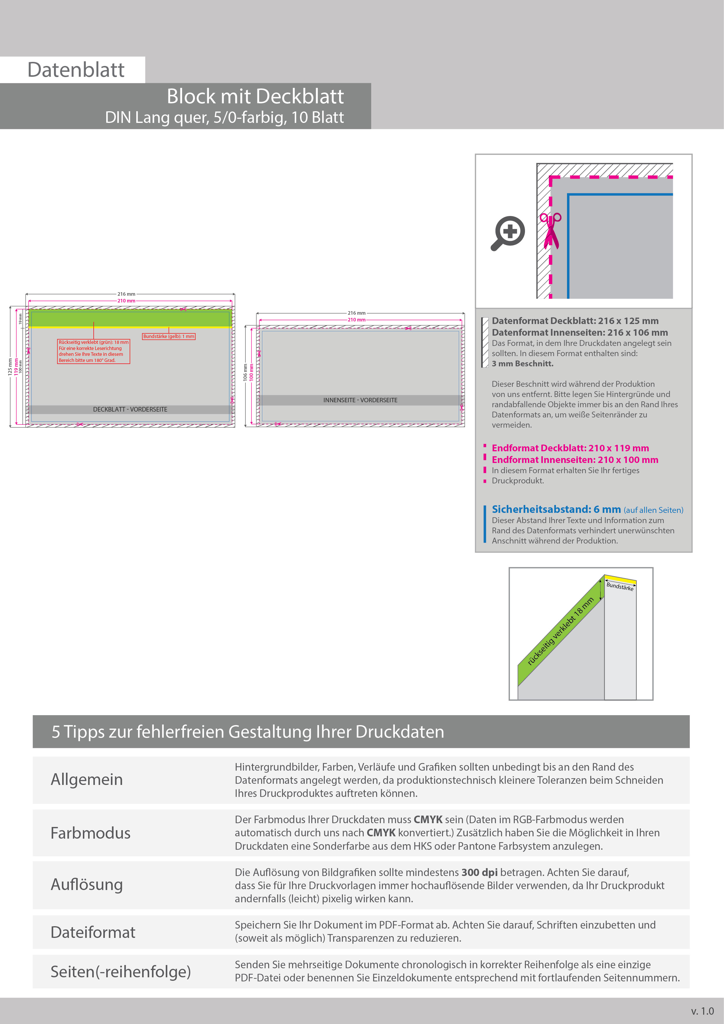 Block mit Leimbindung und Deckblatt, DIN lang quer, 10 Blatt, 5/0 farbig einseitig bedruckt (CMYK 4-farbig + 1 Sonderfarbe HKS oder Pantone)
