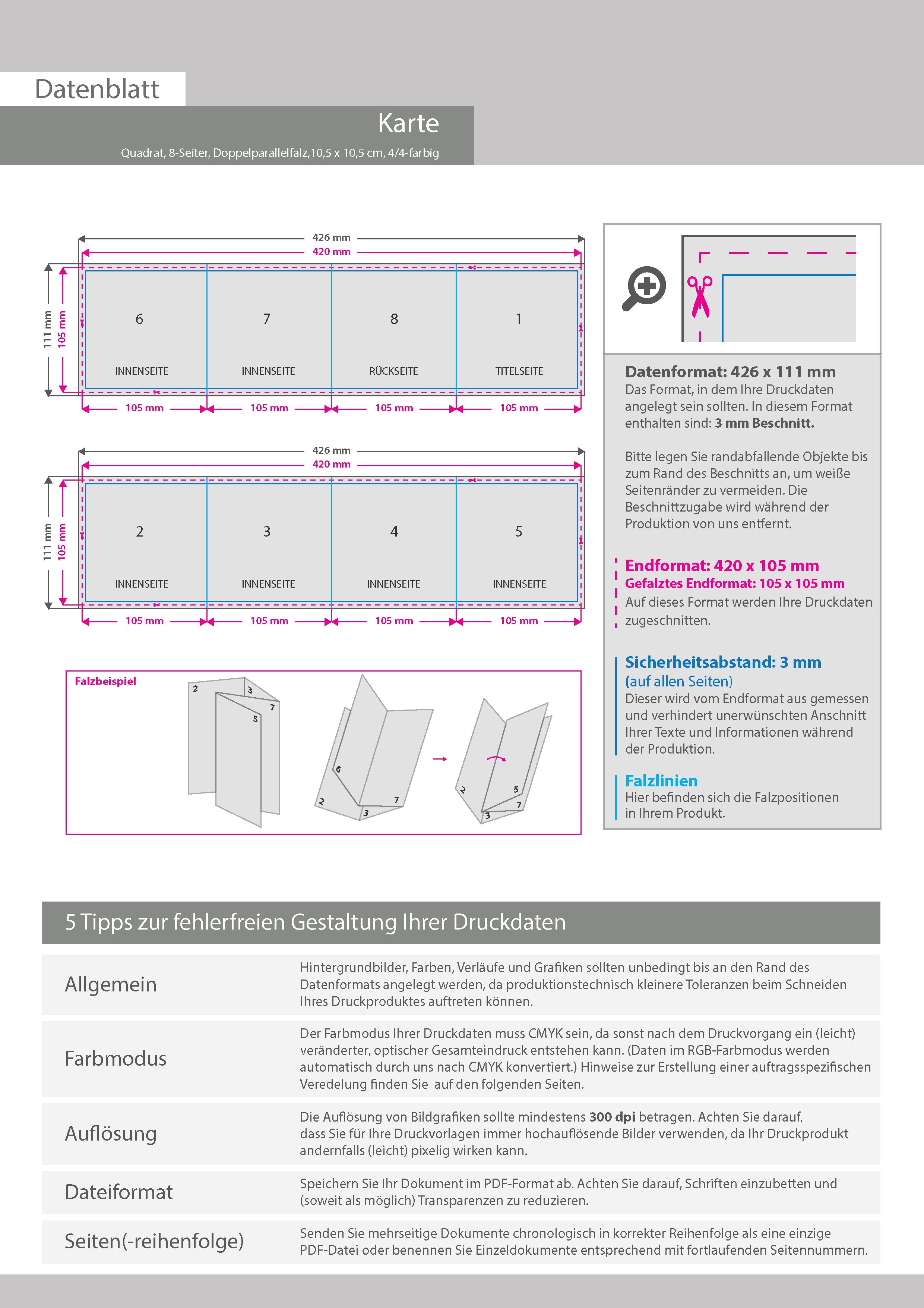 Hochzeitskarte, gefalzt auf Quadrat 10,5 cm x 10,5 cm, vertikaler Doppelparallelfalz, 8-seitig